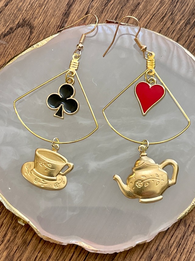 『不思議の国のアリス 』好きさん、集まれ❤️ トランプモチーフ ➕ ティーポットとティーカップを合わせて お茶会のシーンを表現しました✨ イヤリングへ変更可能 アリスの世界観溢れる 唯一無二の耳飾りです♪ 限定2点 上に吊るす トランプモチーフを変更したい方は、 ❤️♠️♦️♣️ 注文画面の備考欄にその旨記載してください。 〜Romantiqa〜 アメリカ製真鍮パーツを使ったロマンティックでアンティークな風合いを愉しむシリーズ メッキなど施さず時間経過と共に風合いの変化を愉しんでいただくアクセサリーです。 ⚫︎ パーツごとに色合い、スタンピング(型押し)に個体差があります ⚫︎明るいゴールドカラーが時間経過とともにくすんだアンティーク調のカラーへ変化します ⚫︎黒ずみ、くすみの発生(黒、赤茶色、緑色など) 真鍮は時間経過によるアンティークな雰囲気へ変化することが特徴であり醍醐味でもありますが、当初の雰囲気に戻したい場合は以下の方法がございます。 ・磨き布で磨く ・レモン汁、お酢につける ・真鍮用磨き剤(ピカールなど)で磨く ・重曹で磨く 等 ネットで「真鍮 お手入れ」等で検索いただきお試しください。 レモン汁などは磨き方によっては真鍮が赤く変色する場合があるためその点もご確認ください。