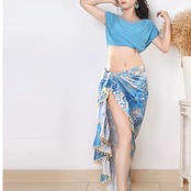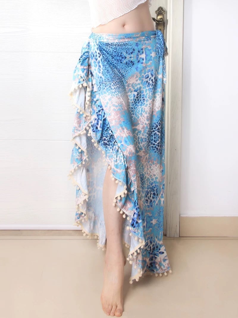 水色ベースのヒョウ柄生地と、裾のボンボン飾りがかわいいラップスカート♡