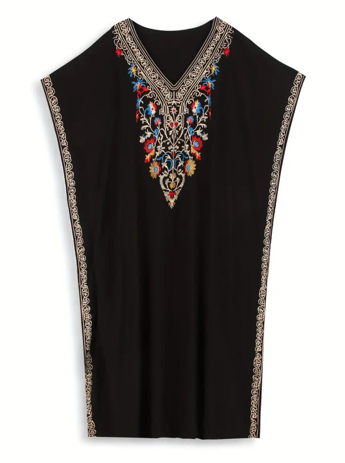Vネック カラフル刺繍 ガラベーヤ 黒