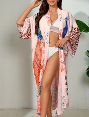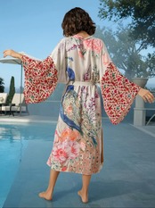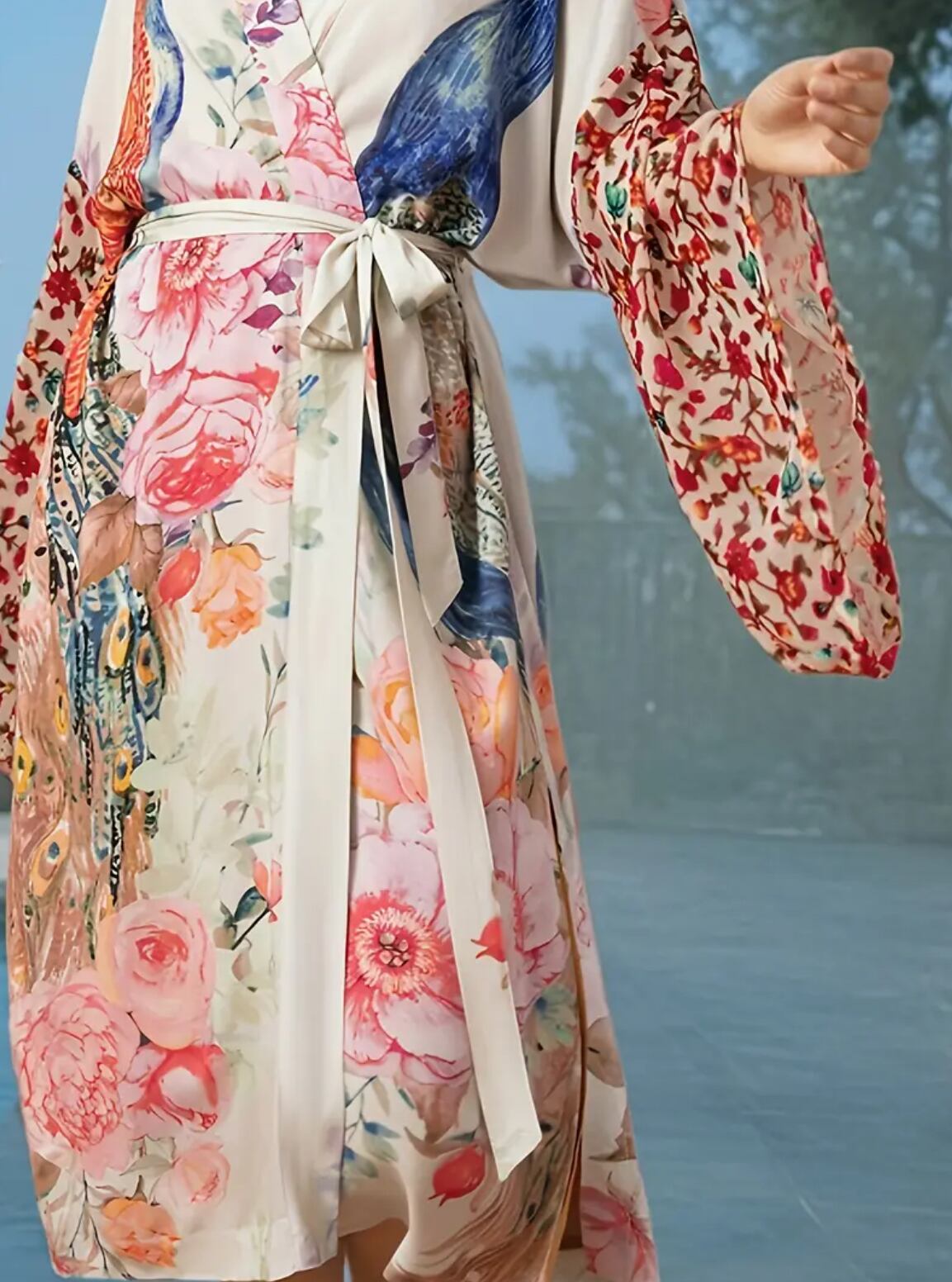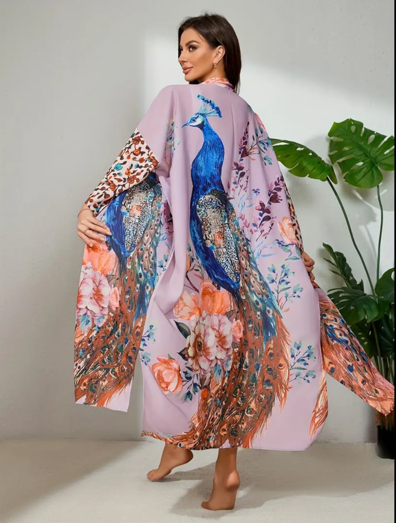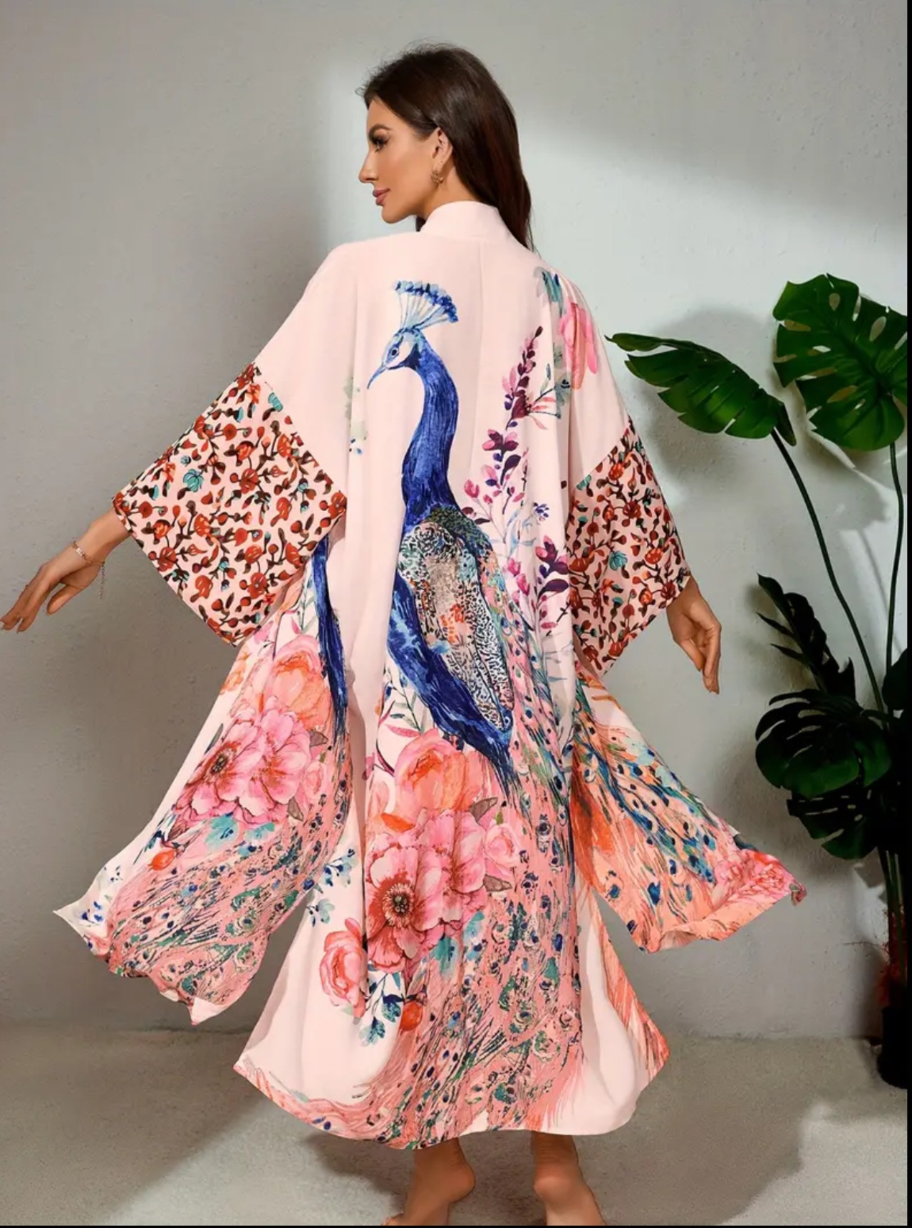 孔雀とお花が華やかにプリントされた着物風ガラベーヤ✨