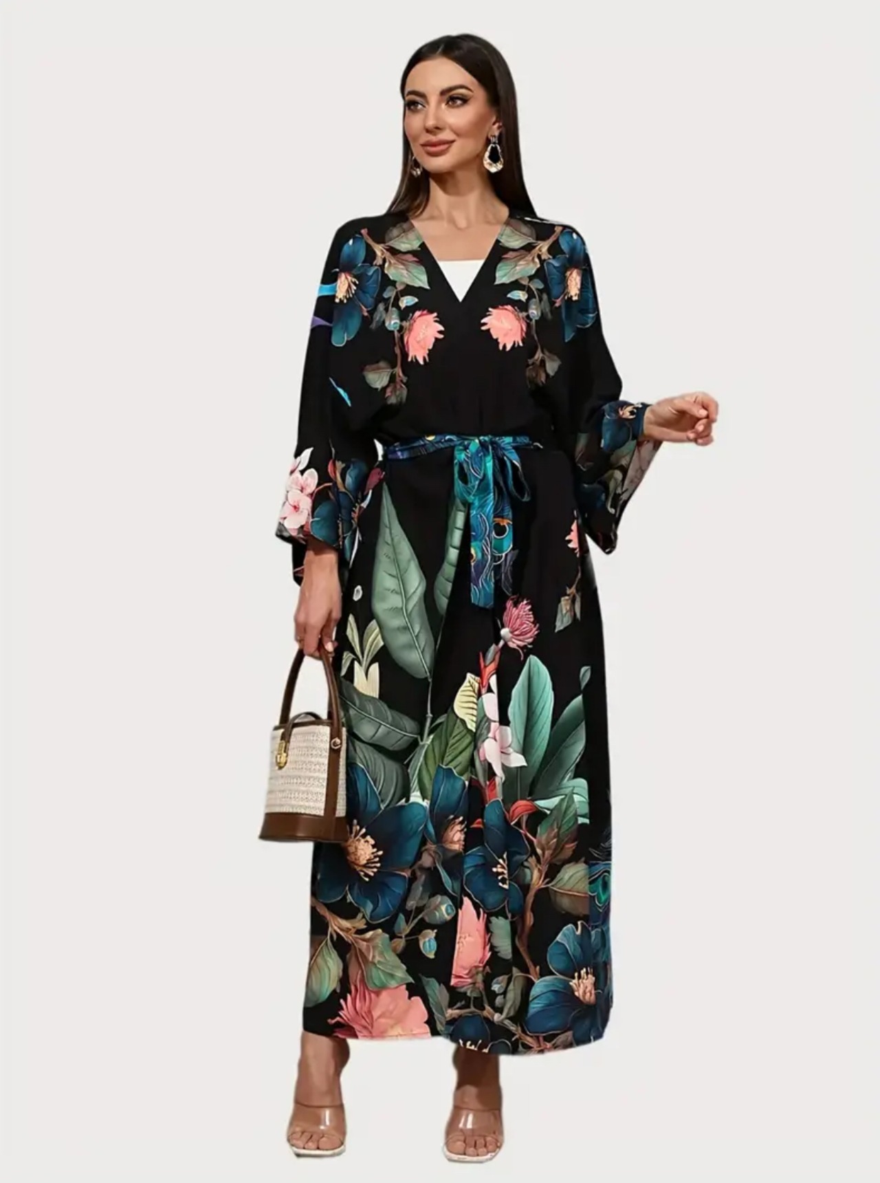 黒地に一際映える色使いで描かれた孔雀と花が美しいガラベーヤ。