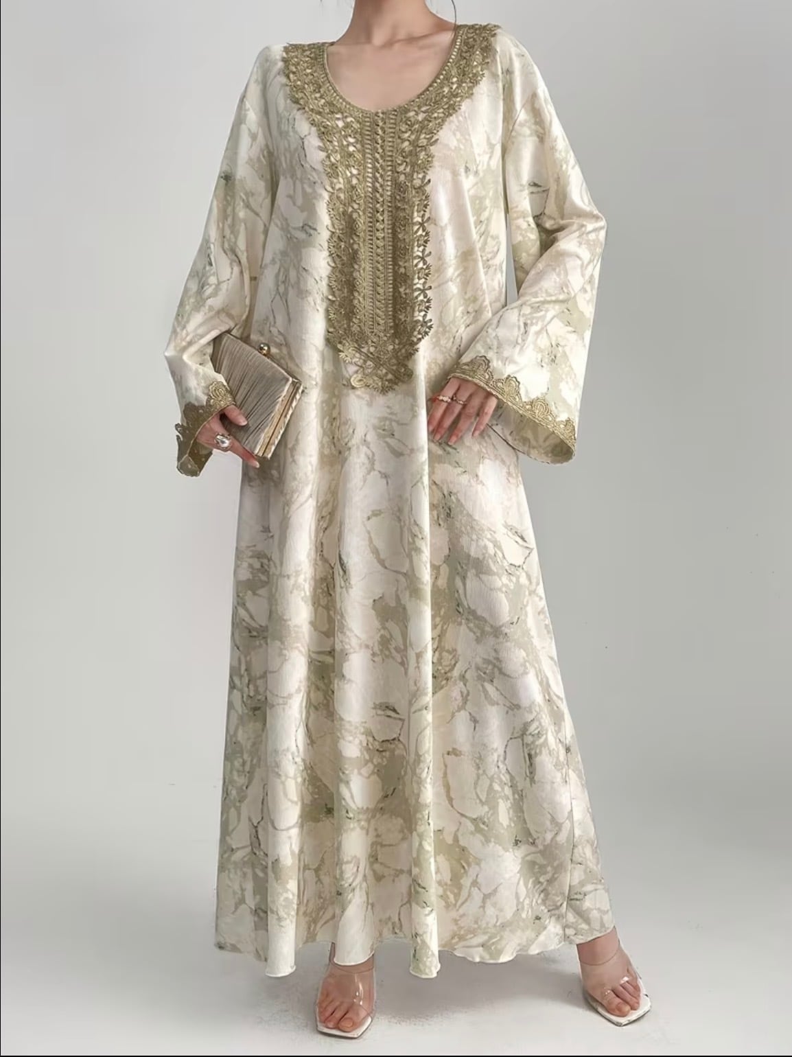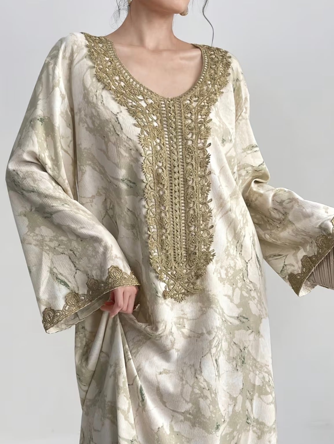 マーブル模様の生地にゴールドのレース飾りが施された美しいガラベーヤ✨