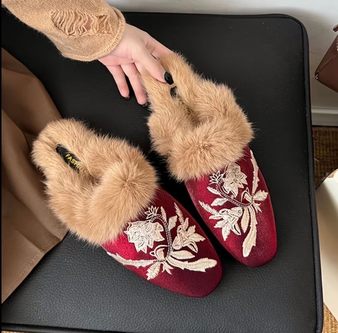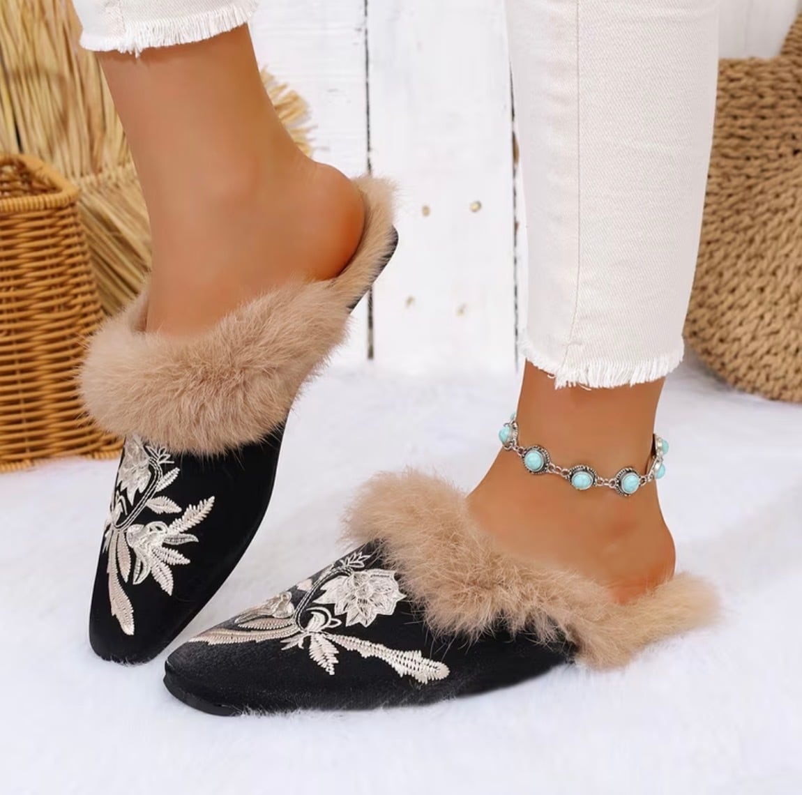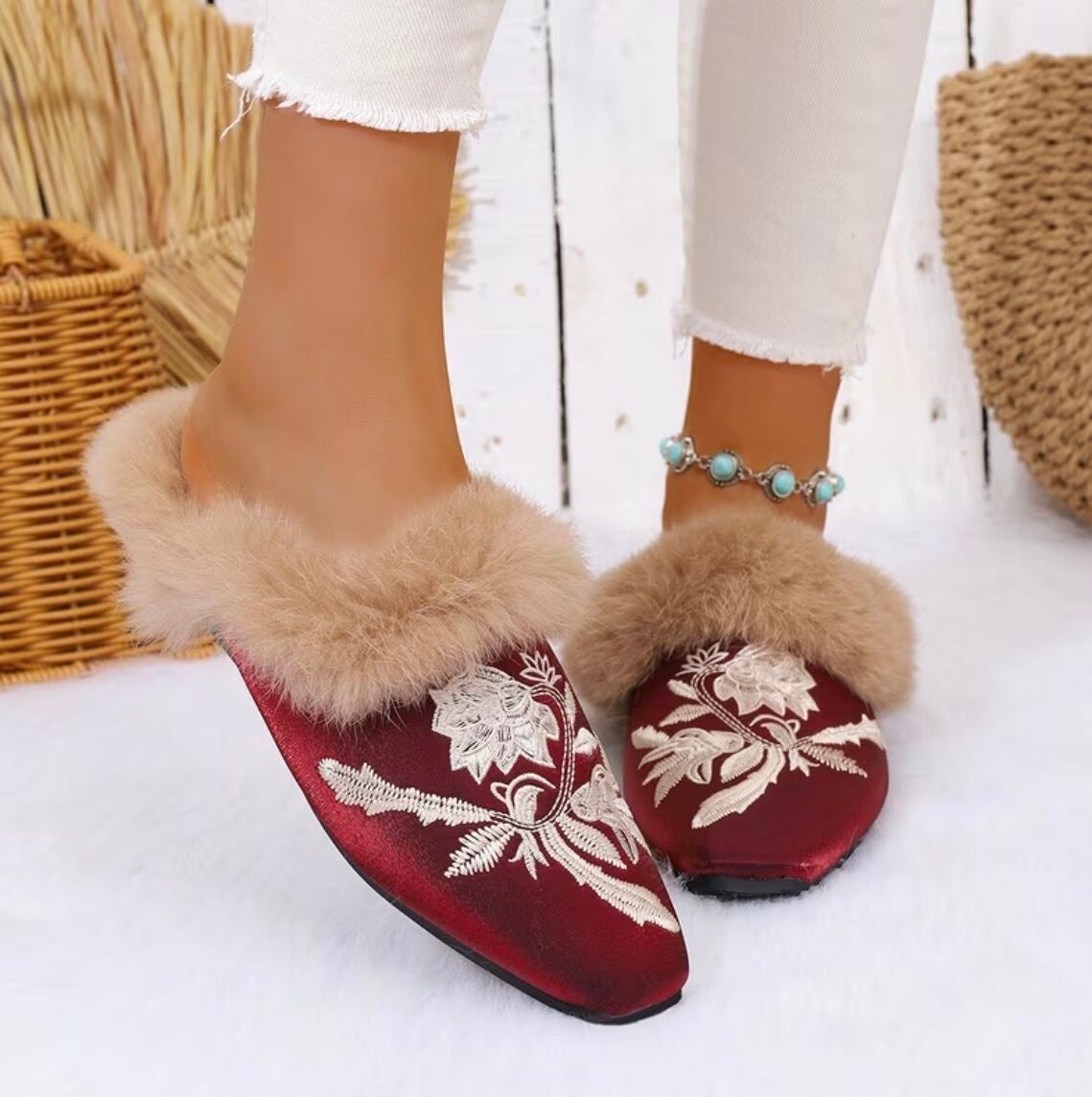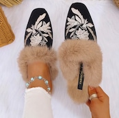 中国風の刺繍が美しいファー使いのスリッパ✨