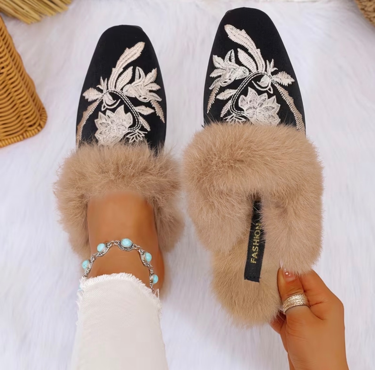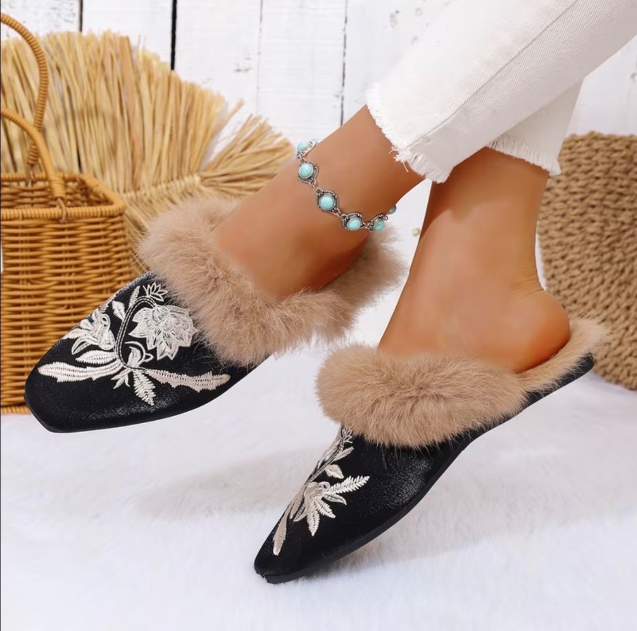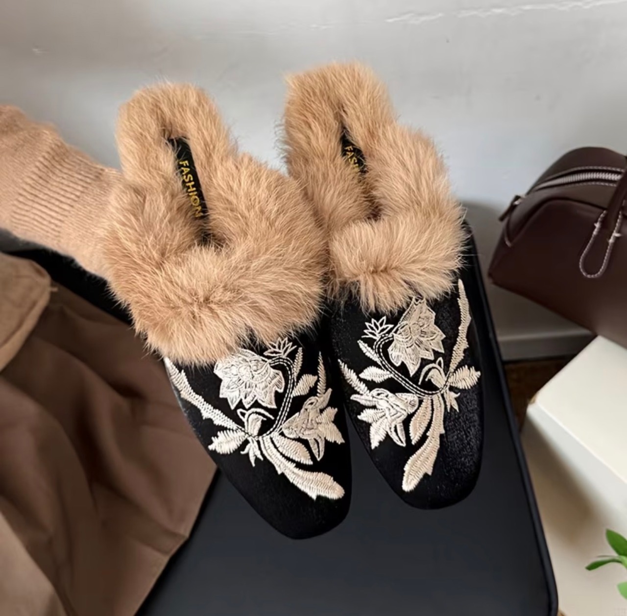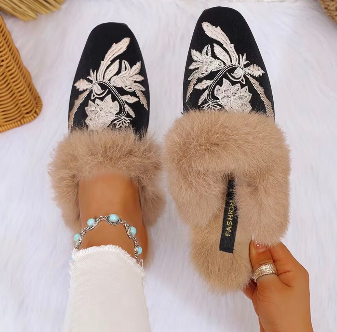 中国風の刺繍が美しいファー使いのスリッパ✨