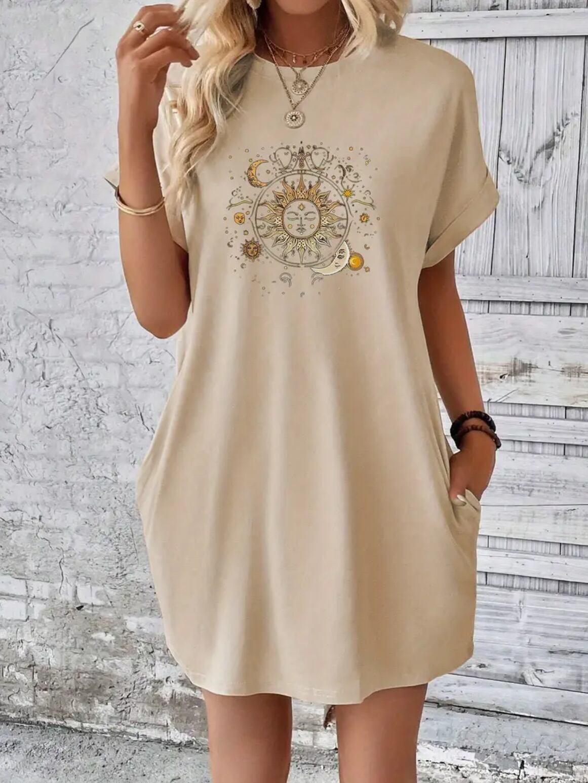綺麗なクリーム色に、太陽と月のデザインがプリントされたワンピースです。