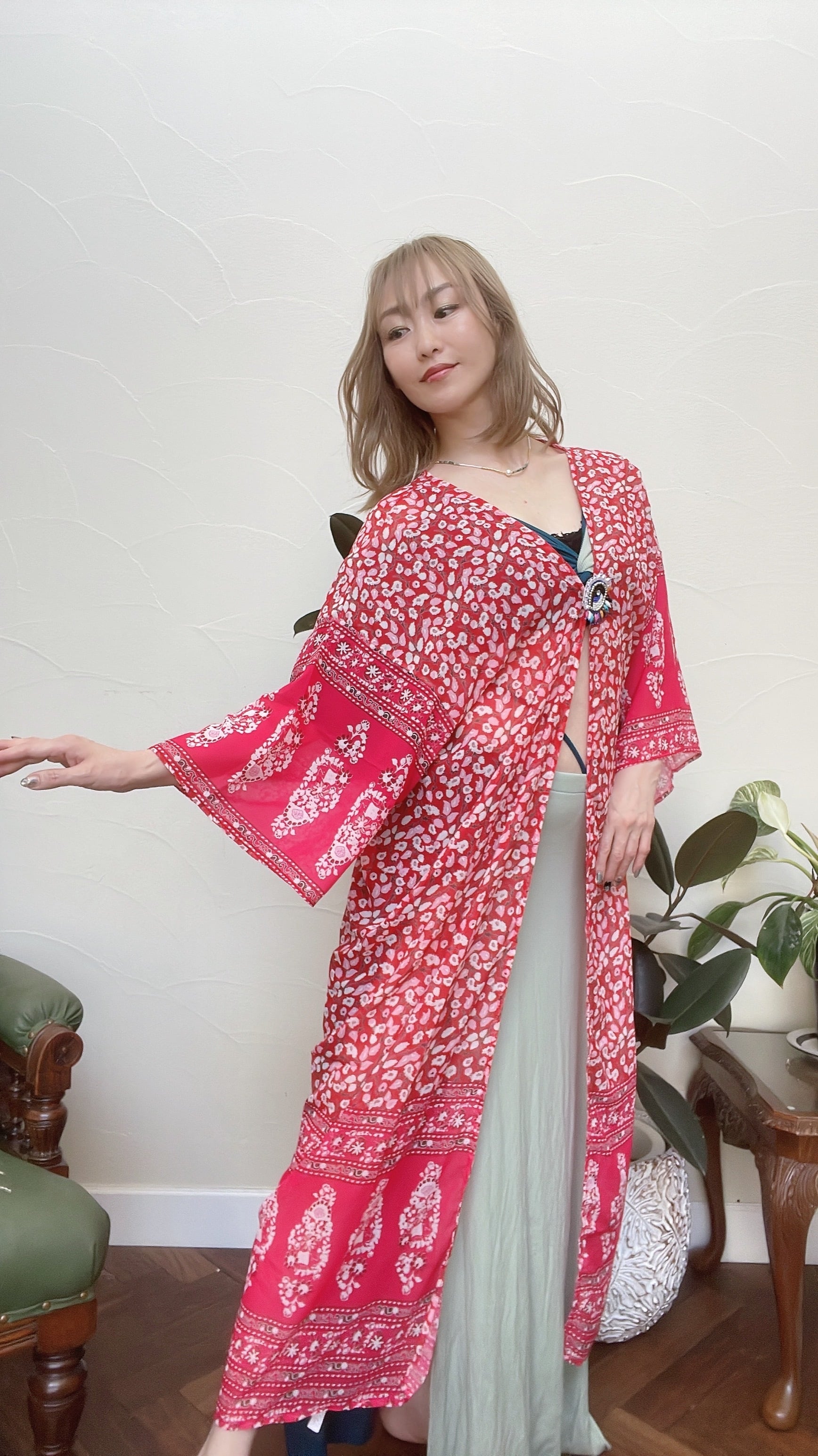明るいピンク地に小さな花柄と裾にオリエンタルな唐草模様があしらわれた、とびきりキュートな羽織です♡