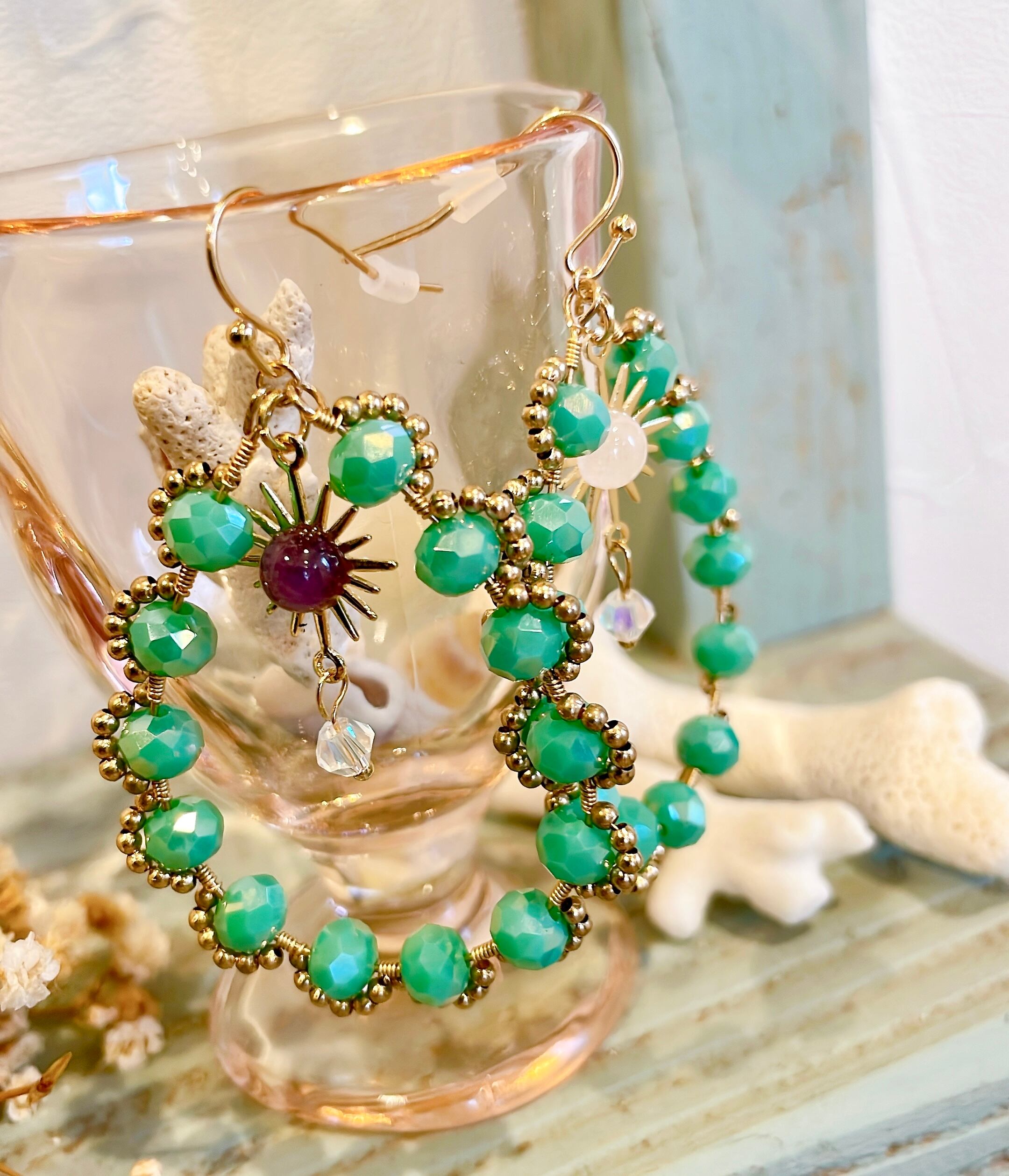 ターコイズグリーンのビーズに縁取られた