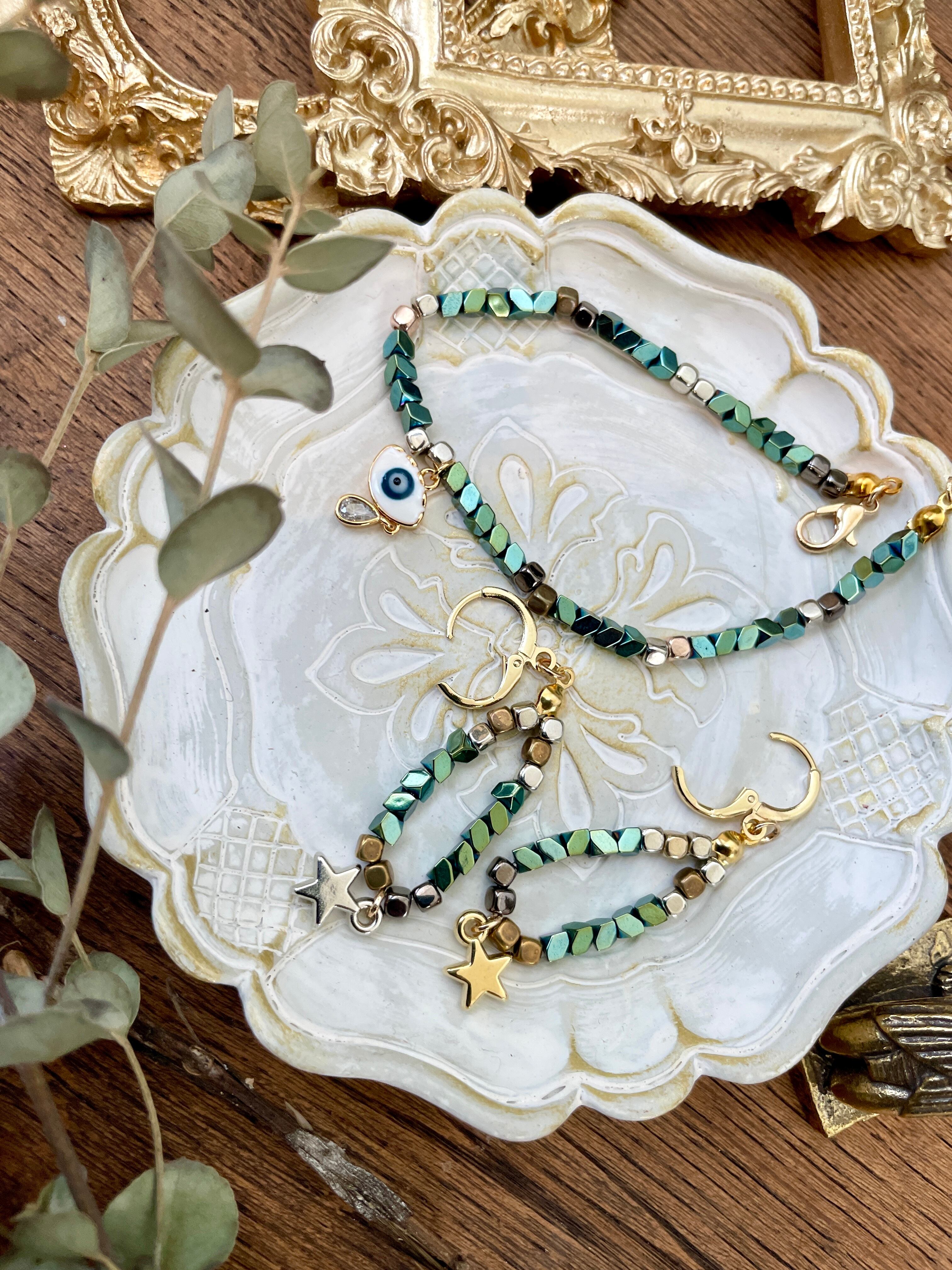 ヘマタイトグリーンピアスとお揃いのブレスレット。