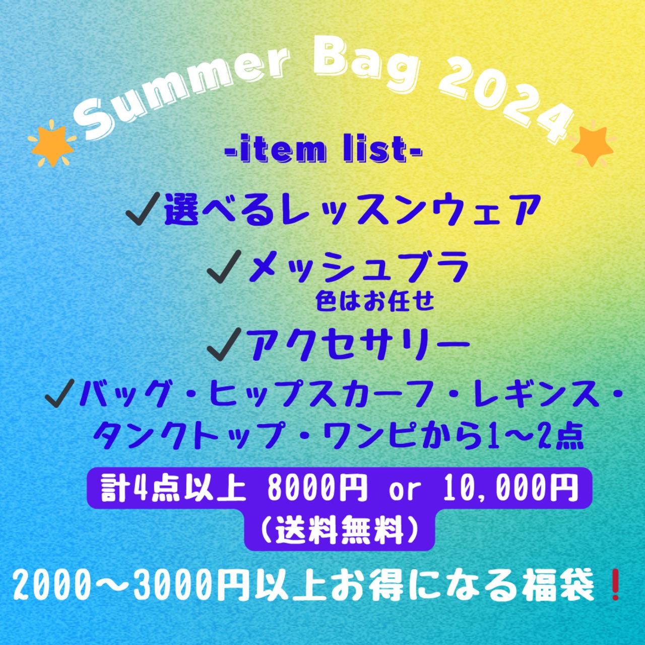 選べるレッスンウェア + 人気のメッシュブラ + ハンドメイドアクセサリー + シークレットアイテムが入った Summer Bag ✴︎