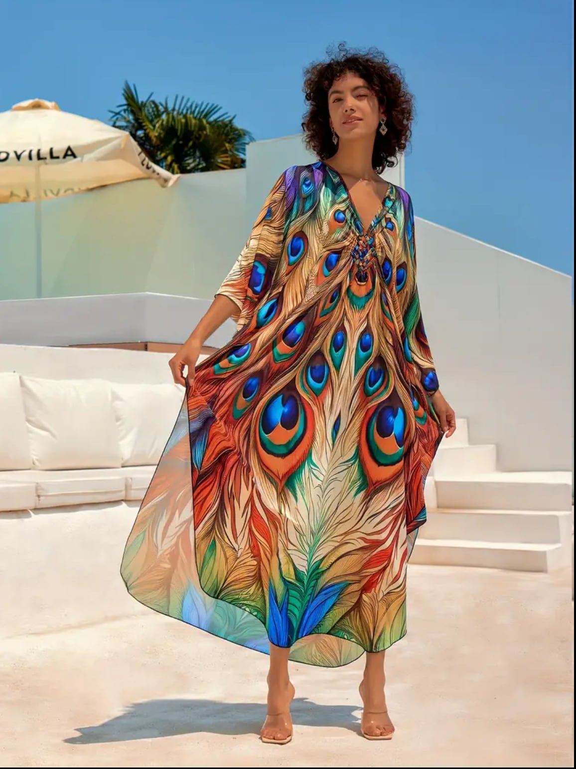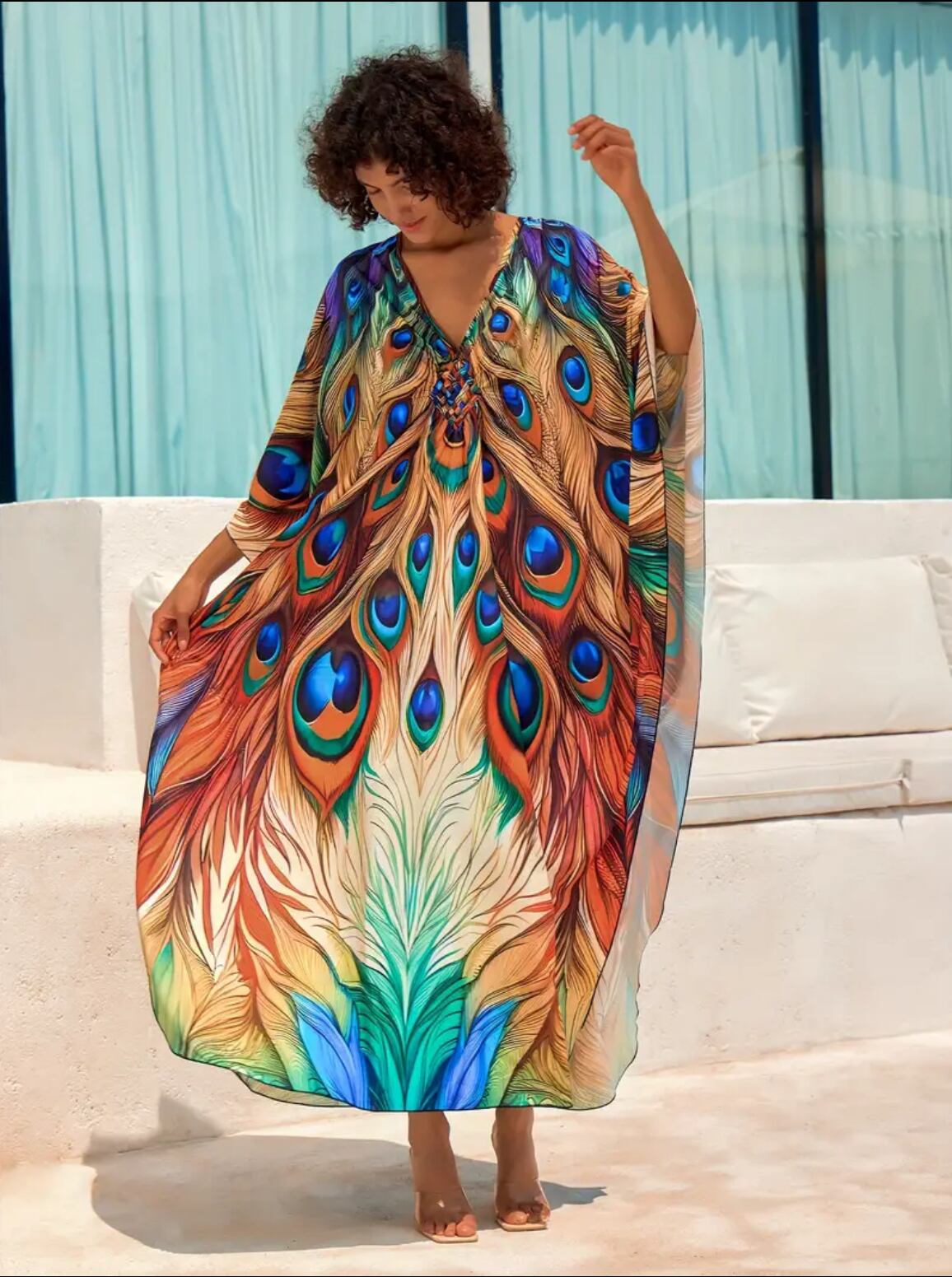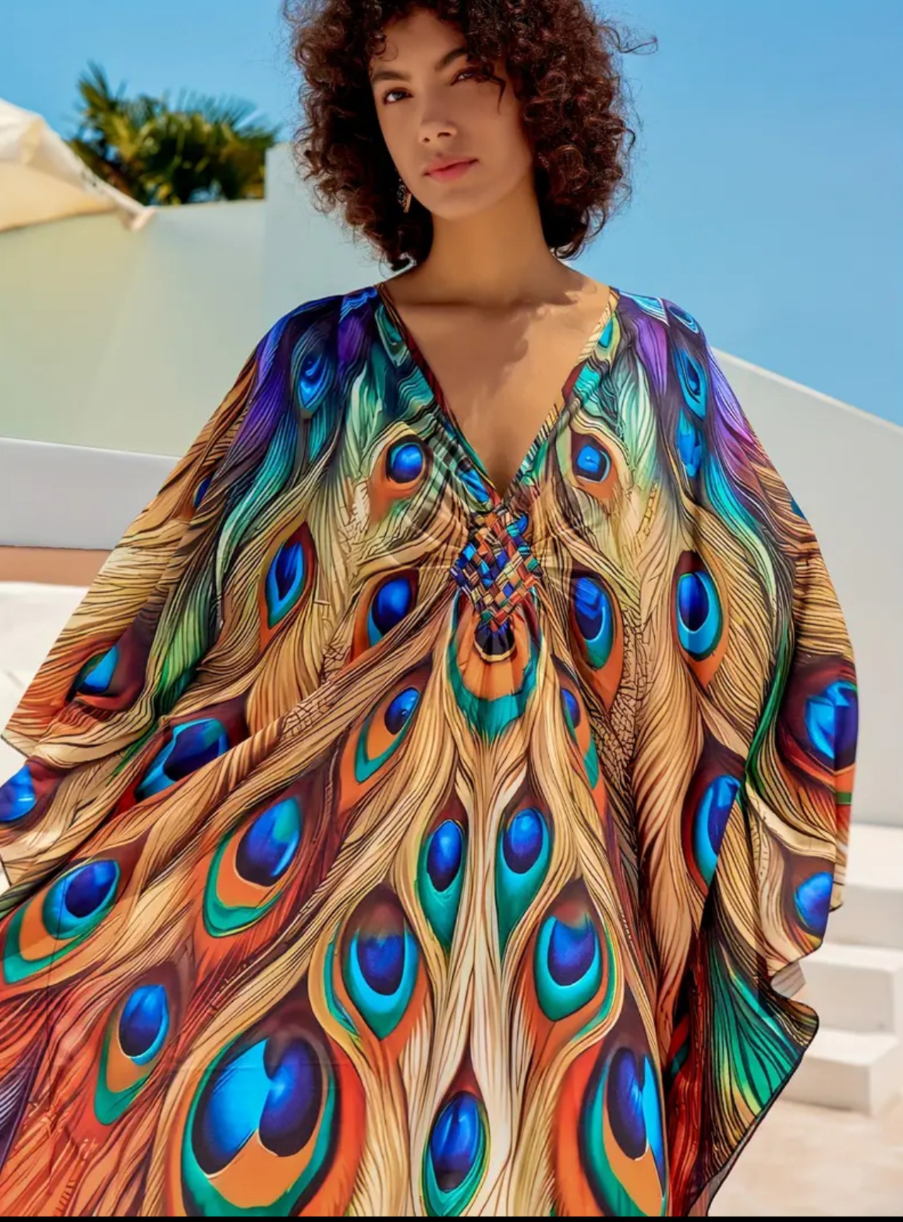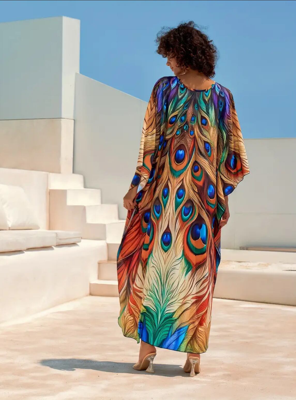 孔雀の羽根プリントが美しいガラベーヤ✨