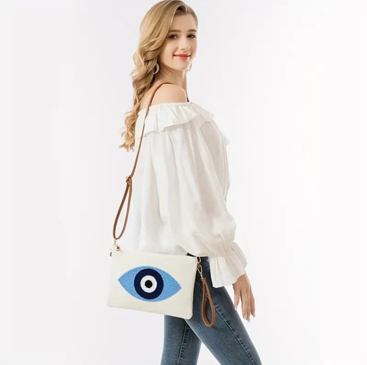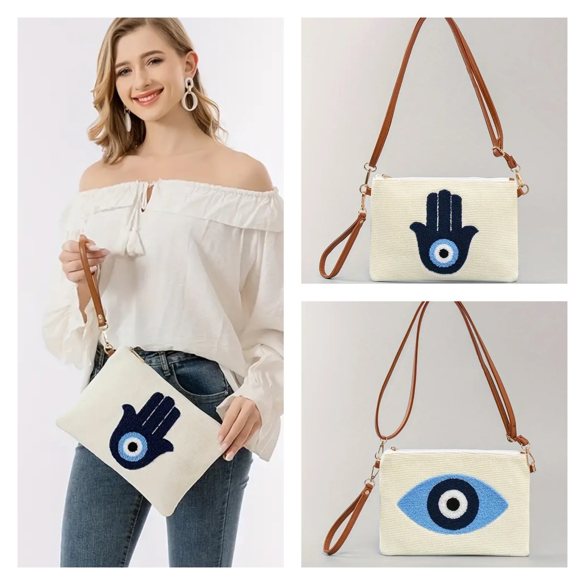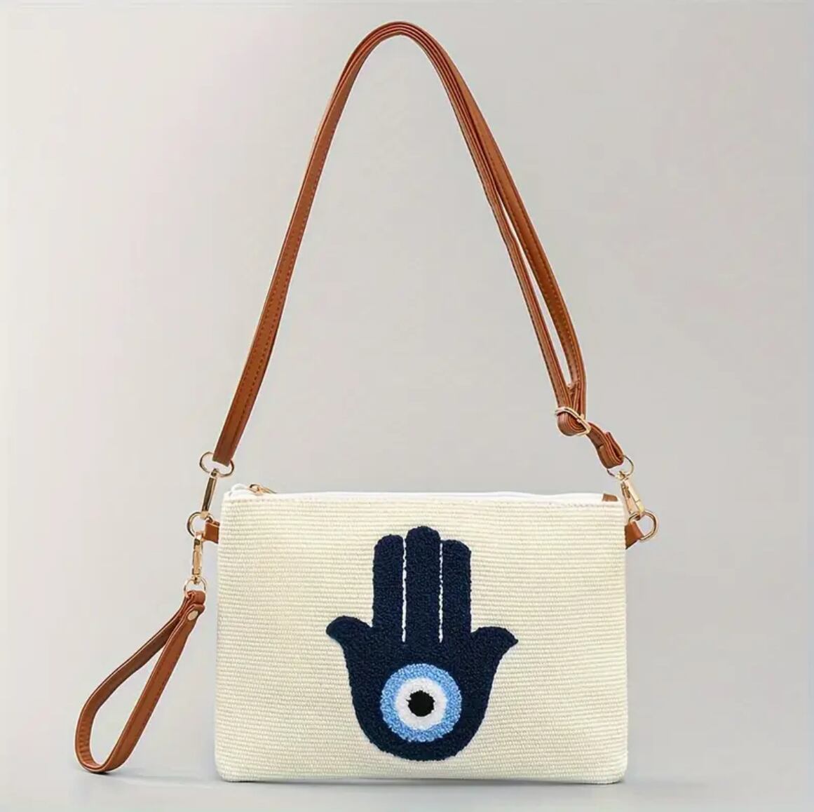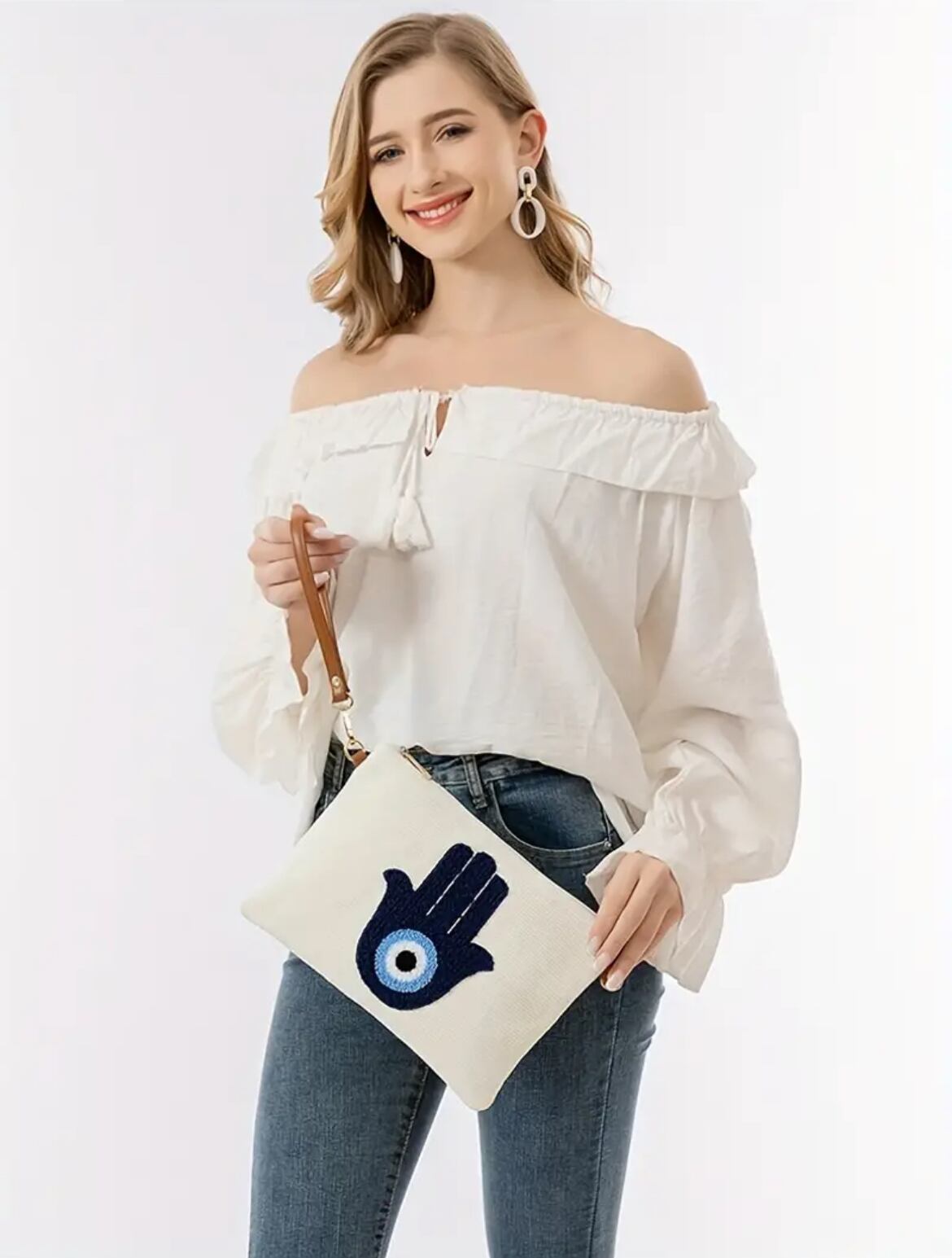 キャンバス地にタオル刺繍の ハムサ/ナザール が可愛い クラッチバッグ!