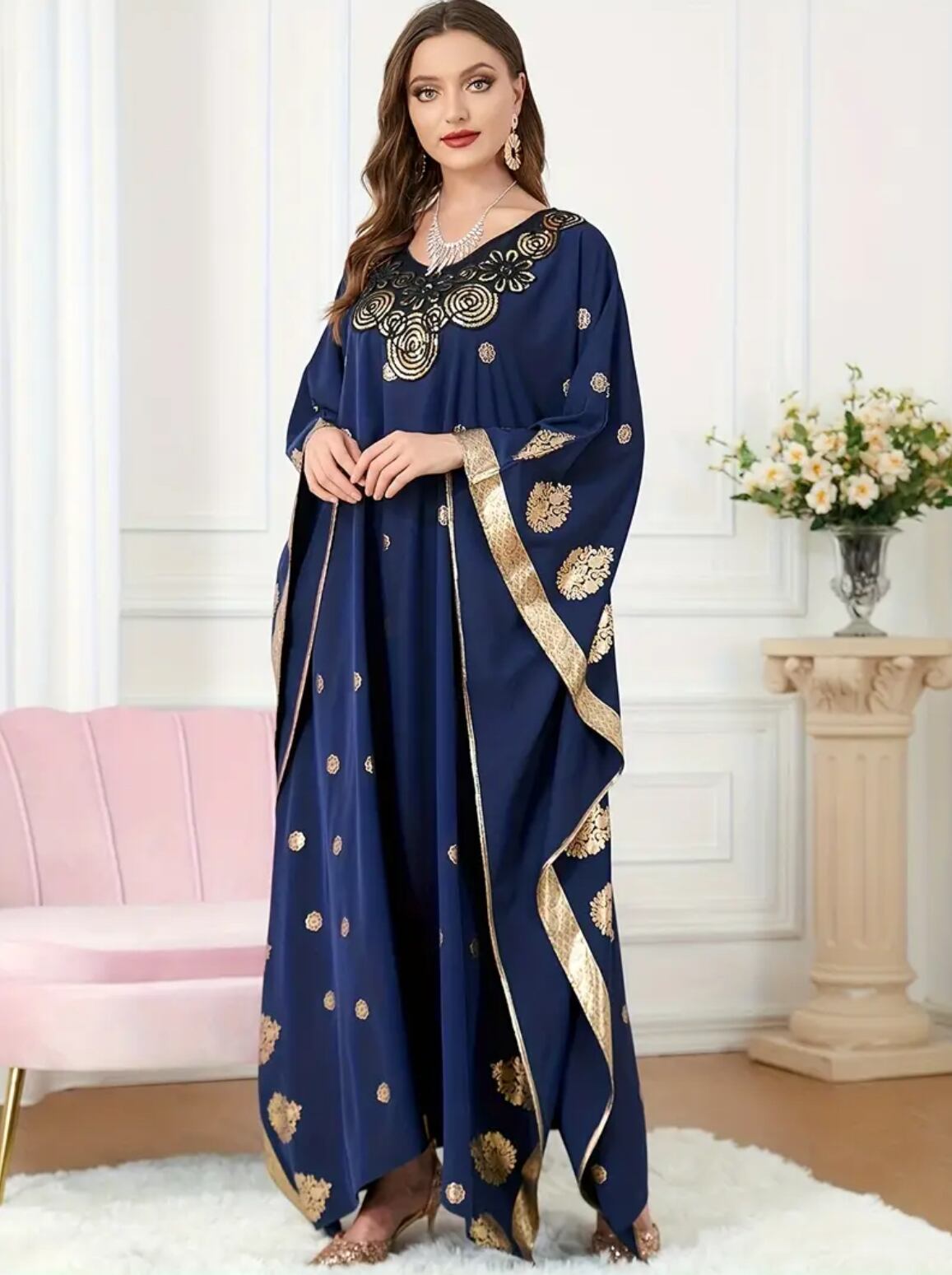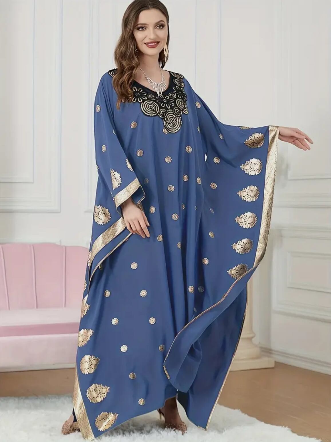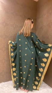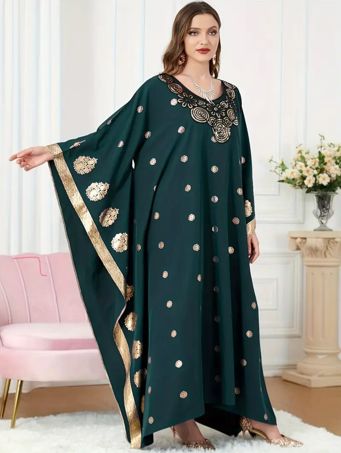 ゴールドの装飾プリントと胸元のスパンコール刺繍が華やかなガラベーヤ 4色展開