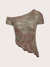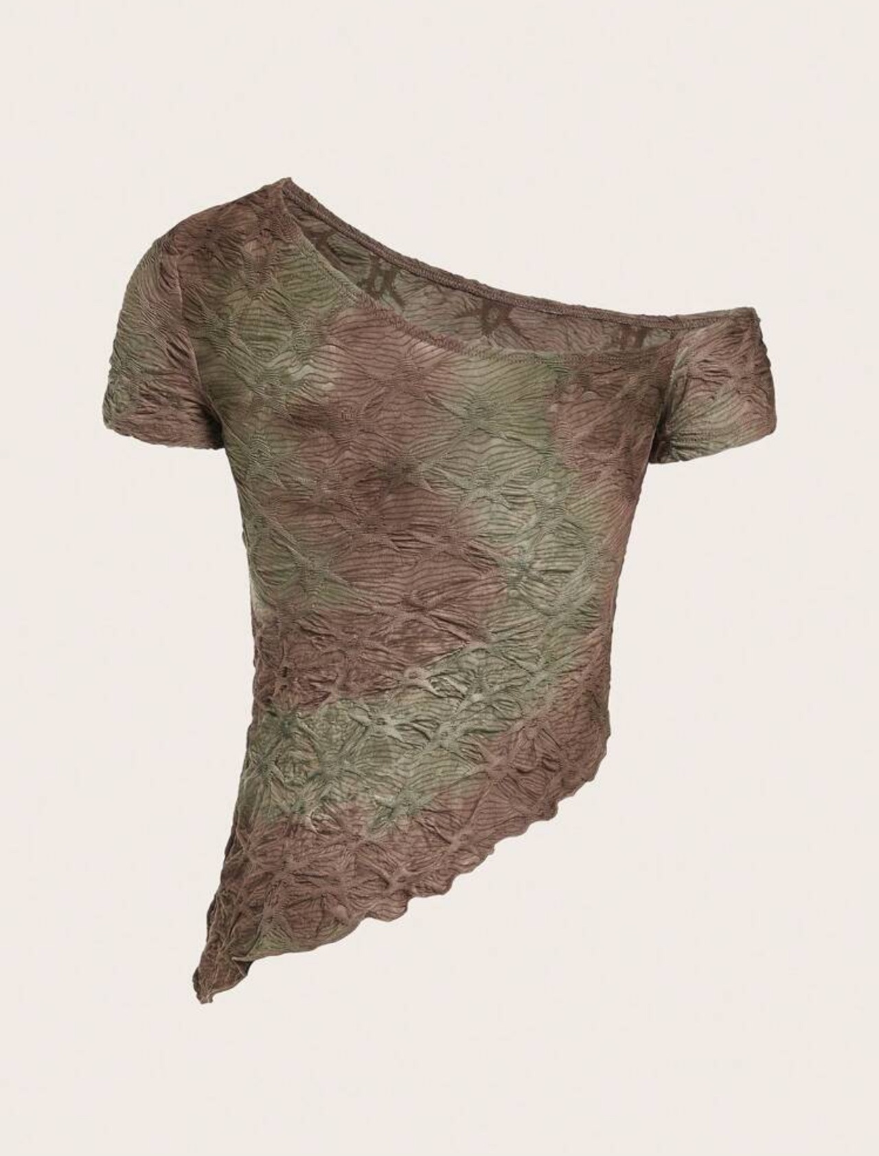 クールな色味の絞り染めといい、アシンメトリーなネックとフレアヘムといい